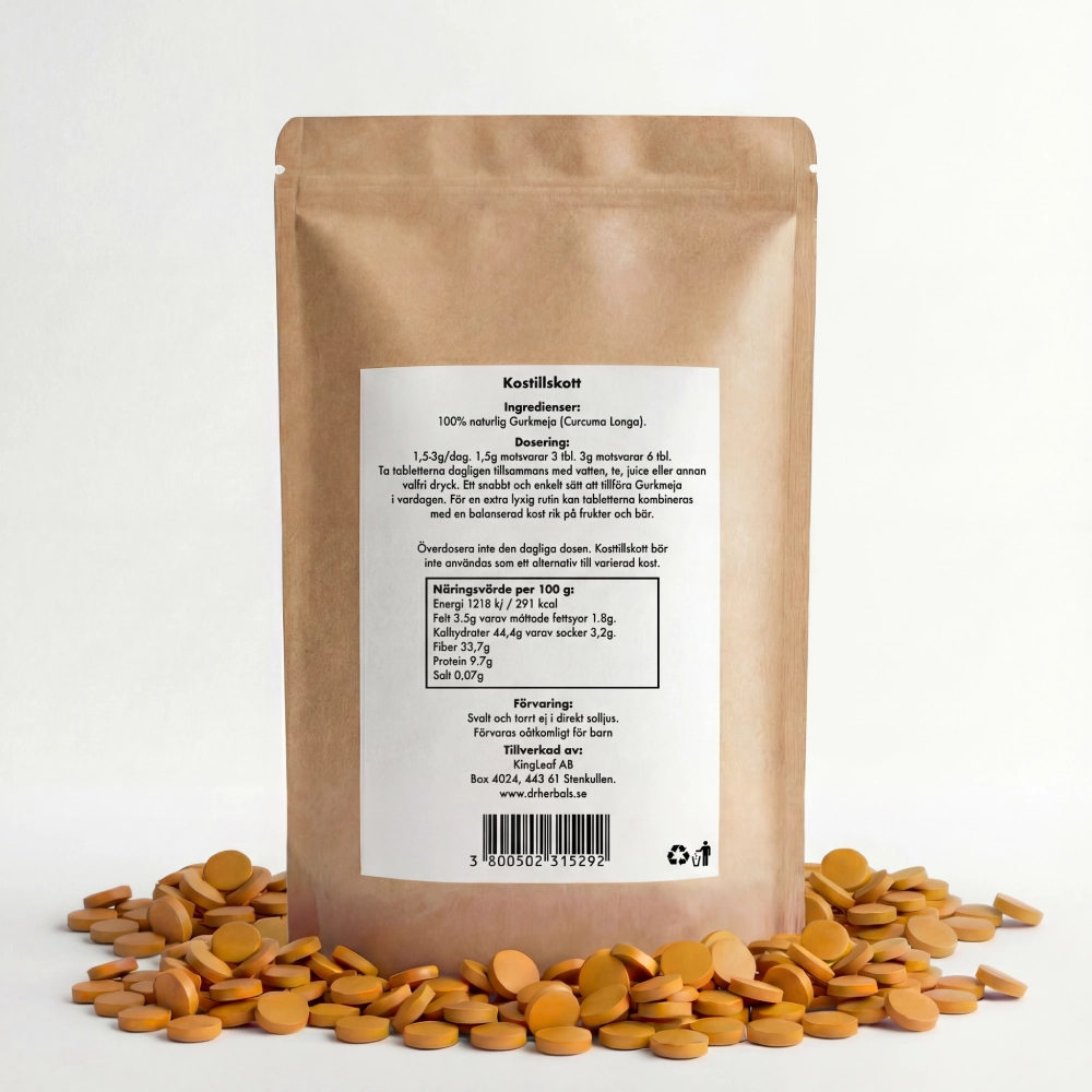 Våra Gurkmeja tabletter är noggrant framställda för att bevara rotens naturliga näringsämnen. Inga tillsatser, fyllnadsmedel, bindemedel eller konstgjorda ämnen – enbart Gurkmeja i sin naturliga form.