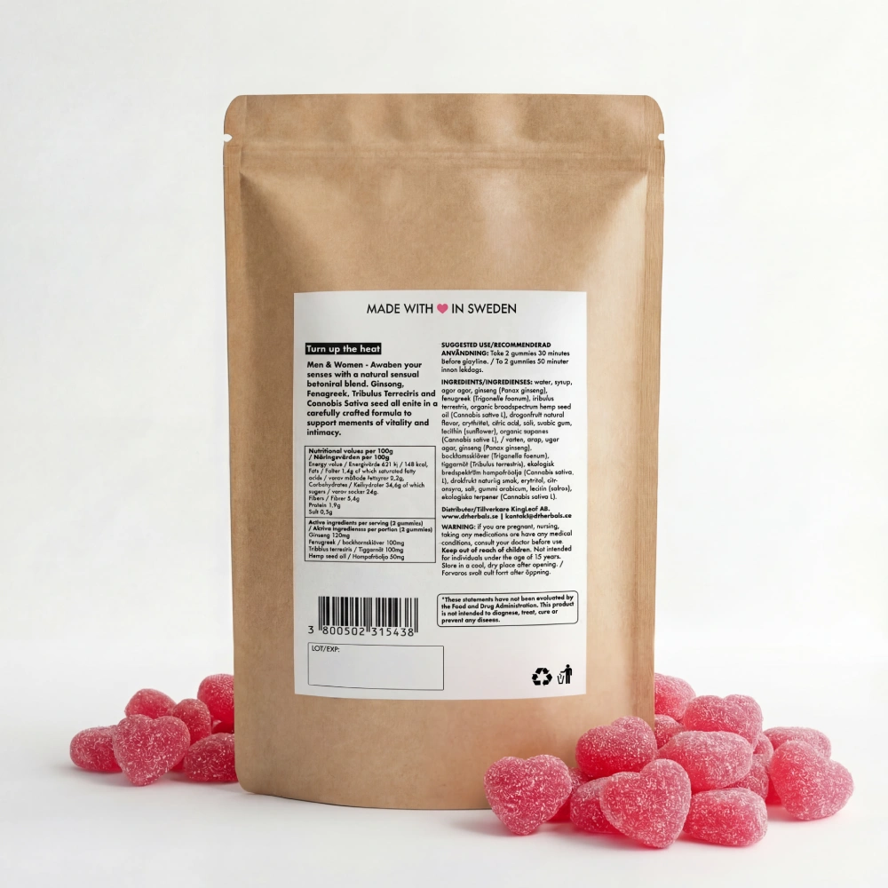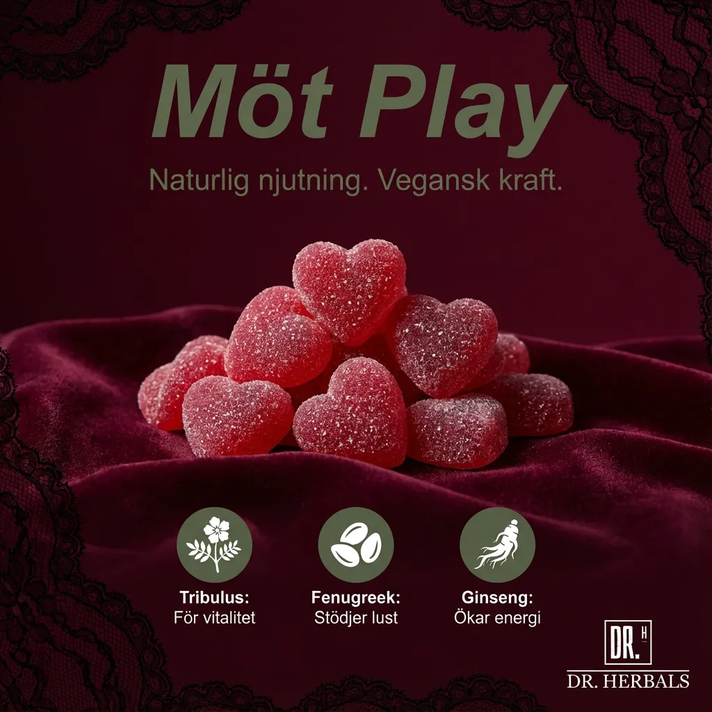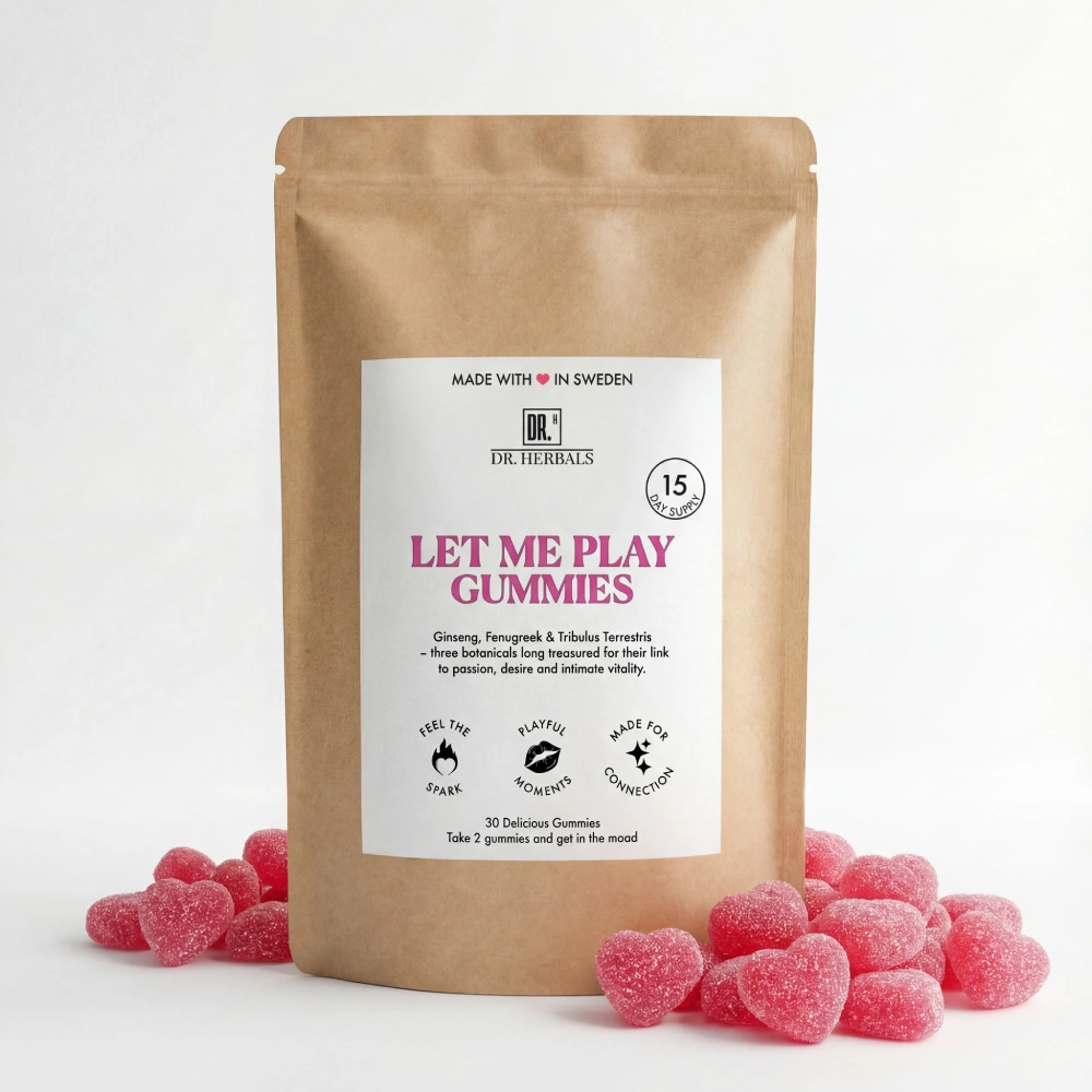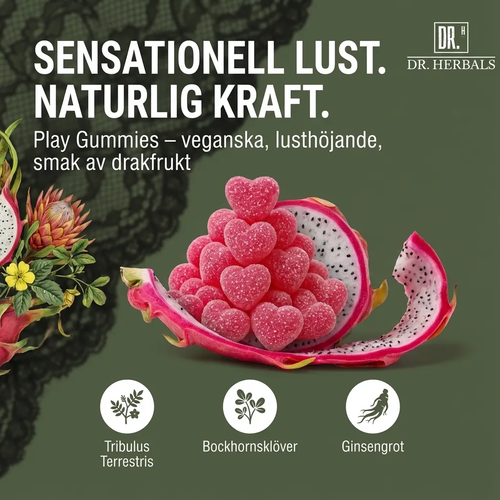 Hetta upp stämningen med våra veganska och populära Play Gummies – ett gott och naturligt sätt att skapa en sensuell stund. Varje gummy innehåller noggrant utvalda ingredienser som tiggarnöt, bockhornsklöver, ginseng och hampafröolja, kända för att stödja libido. Öka lusten och koppla av, utan baksmälla eller tung känsla i kroppen. Med sin stimulerande smak av drakfrukt och en hint av örter är Play Gummies lika god som den är effektiv.